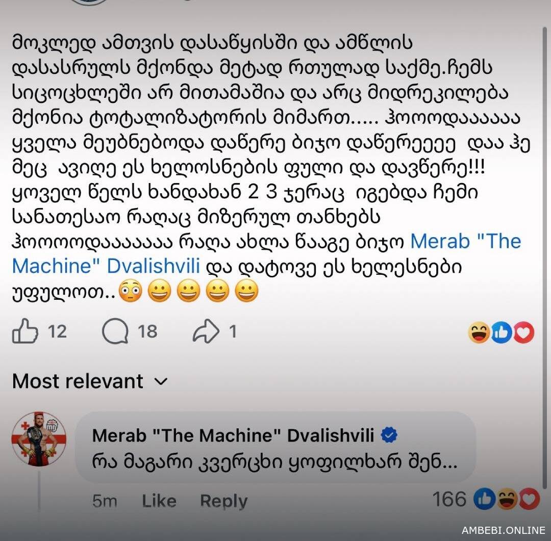 “რაღა ეხლა წააგე ბიჭო და დატოვე ეს ხელოსნები უფულოდ” – მერაბ დვალიშვილი ქართველი ქომაგის კომენტარმა გააღიზიანა – როგორ უპასუხა მებრძოლმა მასზე დაწერილ სტატუსს ?